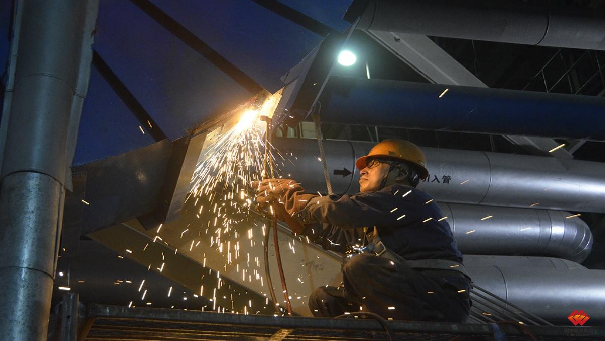 圖為該廠鍋爐焊工加緊進行一次風(fēng)箱的恢復(fù)性焊接。