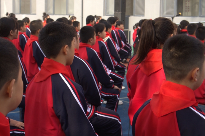 戴著紅領(lǐng)巾的小學(xué)生們坐在國家能源集團(tuán)愛心學(xué)校的操場上 (朱澤雅 攝)