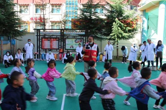 做完篩查的德欽縣幼兒園小朋友們向鄉(xiāng)村醫(yī)生和志愿者打招呼