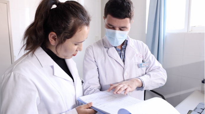 圖為醫(yī)院同事在為布阿依夏木·阿卜杜拉(左)解答疑惑