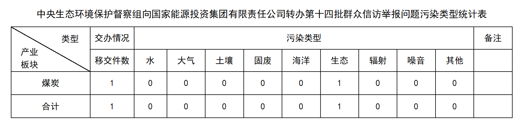 12月10日,中央第五生態(tài)環(huán)境保護(hù)督察組向國(guó)家能源投資集團(tuán)有限責(zé)任公司移交第十四批群眾信訪舉報(bào)件1件,其中來(lái)電1件、來(lái)信0件。本批信訪件涉及生態(tài)環(huán)境問(wèn)題1件,其中生態(tài)1件。