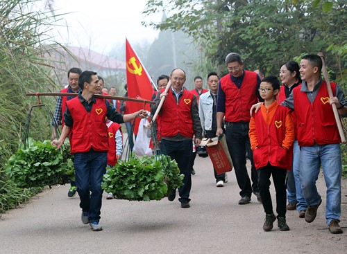 國神白馬愛心志愿者走在田間小路上