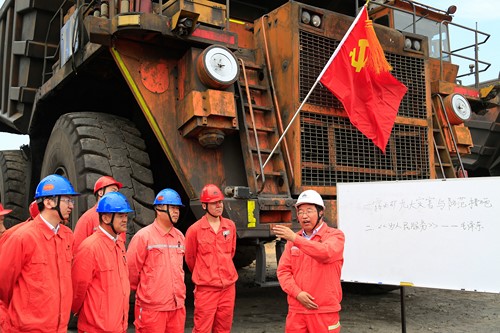 準能-準能集團黑岱溝露天煤礦黨委書記胡存虎在停車作業(yè)區(qū)為該礦運輸隊黨支部黨員干部現(xiàn)場講黨課