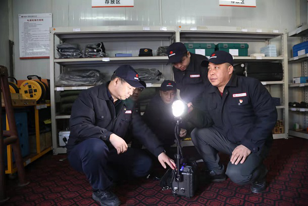 圖為高鳳才正在檢查應(yīng)急救援物資儲(chǔ)備情況