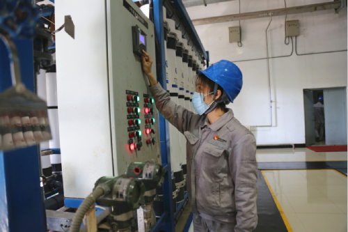 圖為印亮亮正在查看化學設(shè)備儀表指示情況