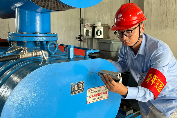 圖為青年人員檢查粗灰磨制系統(tǒng)設(shè)備運(yùn)行情況