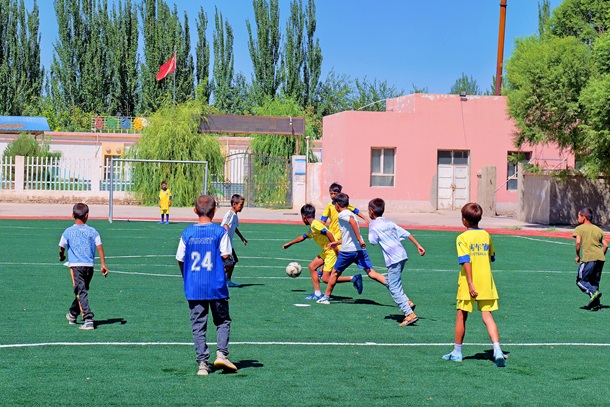 圖為孩子們在新修建的操場踢足球