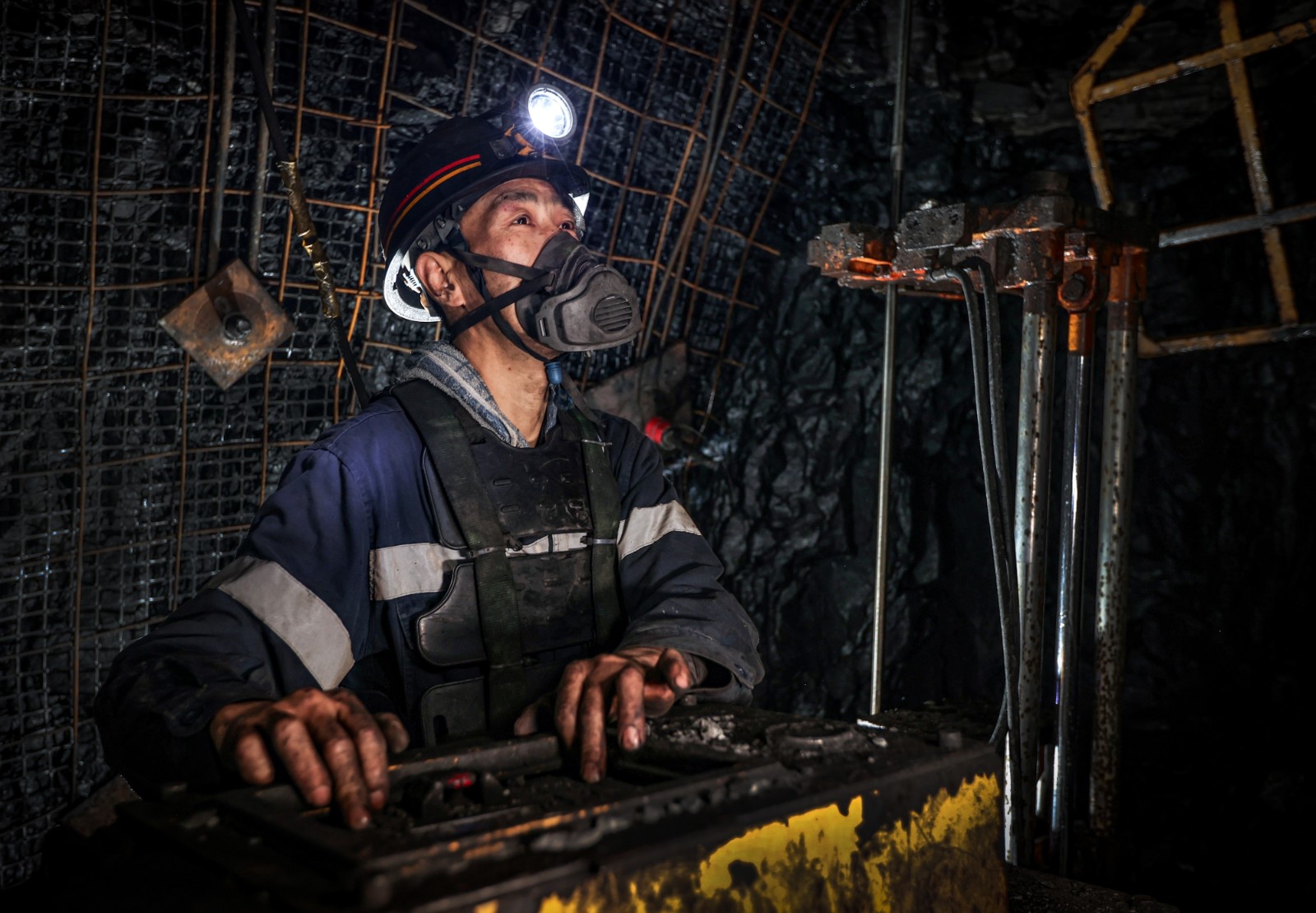 圖為麥垛山礦職工操作錨桿鉆機(jī)對巷道頂板進(jìn)行支護(hù)作業(yè)