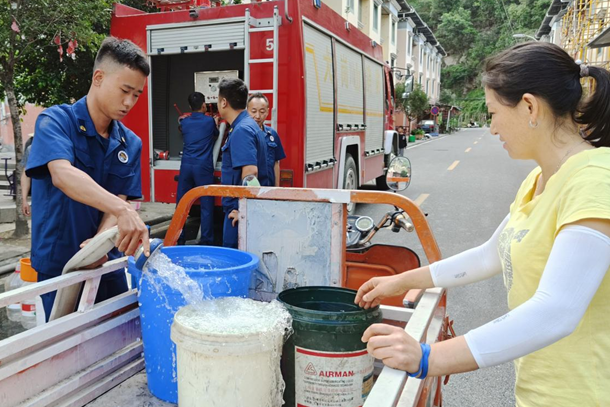 面對(duì)持續(xù)高溫天氣,該公司高度重視電站周邊集鎮(zhèn)居民生活供水中斷問題,充分利用站內(nèi)資源,立即協(xié)調(diào)專職消防隊(duì)為當(dāng)?shù)鼐用耖_展送水服務(wù),為老弱病殘家庭落實(shí)送水到家需求,全力保障人民群眾生活需要,解決老百姓的燃眉之急?!罢媸翘皶r(shí)了,解決了我們的飲水問題,真心謝謝你們!”當(dāng)?shù)鼐用窦娂姳硎靖兄x。