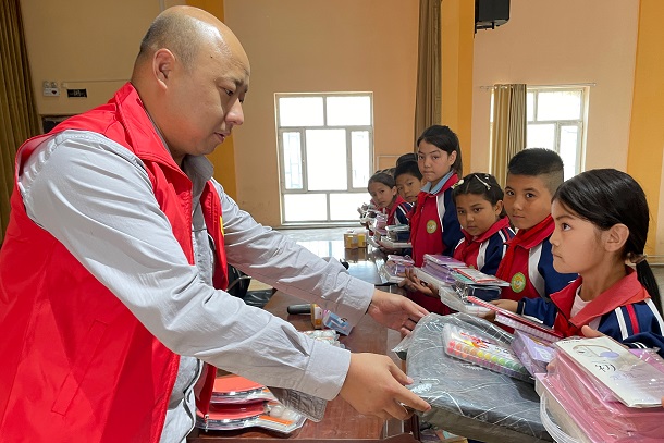 圖為張成國給學生贈送文具