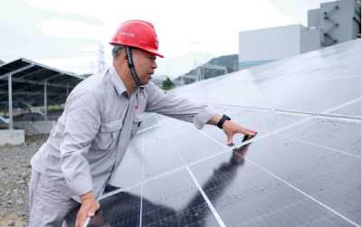 圖為寧海電廠工作人員正在檢查光伏板(寧海電廠劉志林?jǐn)z)