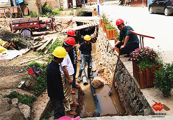 圖為該公司駐村干部檢查臘坑村污水收集管網(wǎng)施工