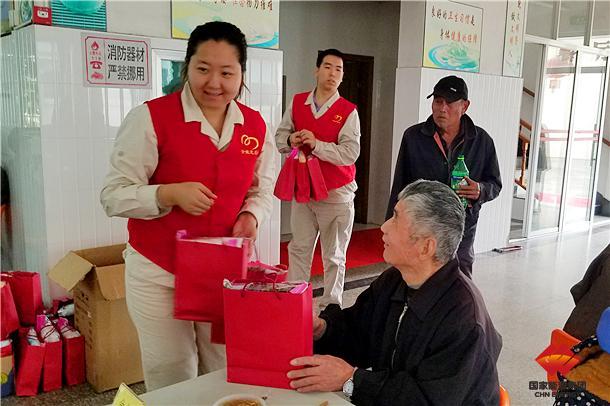 圖為該廠志愿者正在為老人發(fā)放慰問品。