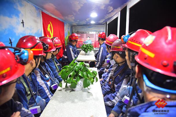圖為神東大柳塔綜采五隊在井下收看慶祝中國共產(chǎn)黨成立100周年大會盛況