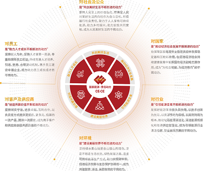 CE·CE分別代表國家能源(China Energy)、責任動力(CSR Energy)。社會責任模型以日晷原型為基礎(chǔ),以“國家能源,責任動力(CE·CE)”為原點,由“六大動力”和“六大體系”兩環(huán)構(gòu)成主體,共同推進企業(yè)社會責任管理和實踐。