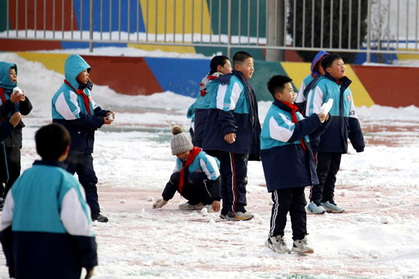 圖為學(xué)生在新朔鐵路捐建的標(biāo)準(zhǔn)化操場(chǎng)上打雪仗