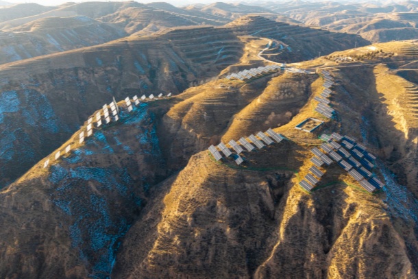 冬日,米脂縣楊家溝與高西溝的山峁間,盡是溝壑縱橫的蒼茫,就在這一片蒼茫之中,一排排深藍(lán)色的光伏板錯落有致地鋪展在山坡上,在冬日暖陽的映照下熠熠生輝。