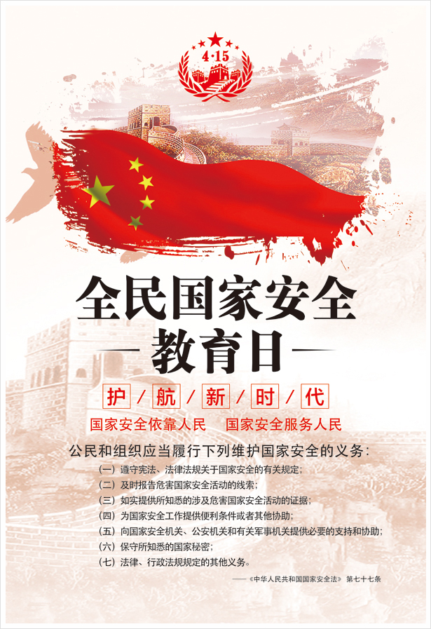 今年4月15日,是黨的十九大后第一個全民國家安全教育日。深入開展國家安全宣傳教育,切實(shí)增強(qiáng)全體干部職工國家安全意識,是集團(tuán)公司貫徹落實(shí)新形勢下國家安全工作部署的重要任務(wù),是建設(shè)具有全球競爭力的世界一流能源集團(tuán)的重要保障。為進(jìn)一步普及國家安全知識,集團(tuán)網(wǎng)站特制作專題,希望全體干部職工認(rèn)真學(xué)習(xí),進(jìn)一步增強(qiáng)國家安全意識,依法履行維護(hù)國家安全的職責(zé)和義務(wù),筑牢國家安全“鋼鐵長城”。