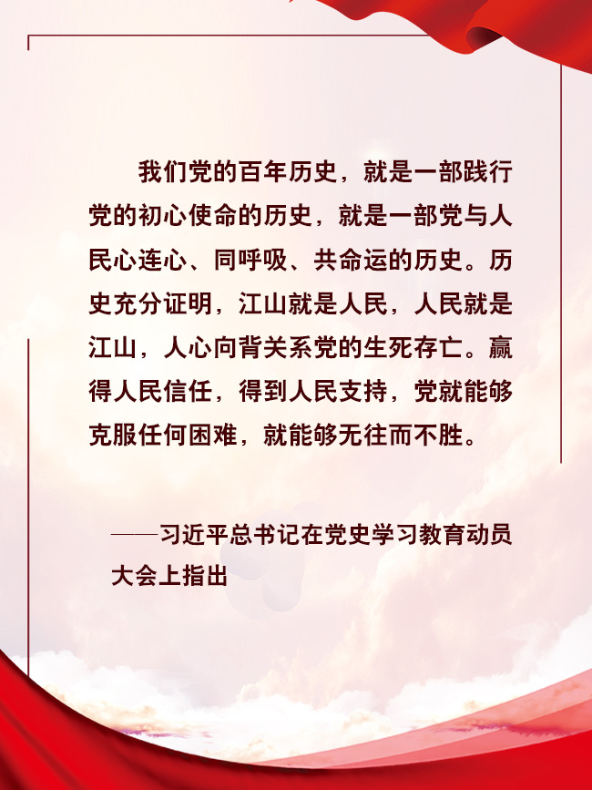 百年征程波瀾壯闊,百年初心歷久彌堅(jiān)。站在“兩個(gè)一百年”的歷史交匯點(diǎn)上,更需要廣大黨員干部學(xué)史明理、學(xué)史增信、學(xué)史崇德、學(xué)史力行,從黨史中汲取不竭的精神動(dòng)力,始終堅(jiān)持人民至上,緊緊依靠人民、不斷造福人民、牢牢植根人民,與人民心心相印、與人民同甘共苦、與人民團(tuán)結(jié)奮斗,與億萬(wàn)人民一起奔向更美好的未來(lái)。(文字:劉躍江 海報(bào):張倩)